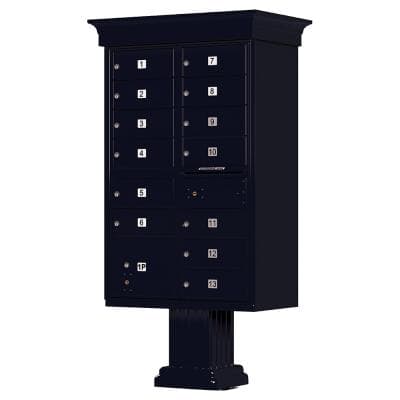 Front loading, pedestal mounted CBU mailbox includes a carrier access door prepared for a USPS arrow lock (installed by local postal officials) for delivery/service to mailbox.